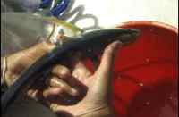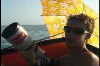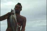 | This is Dave Post. Dave, wave hello to everyone. Dave is trying to start up the dingy. You would think it might be pretty easy....but have, you done it? Well, anyway Dave couldn't. He pulled it one hundred and twelve times, growing ever more fustrated. Then he tried to paddle the dingy back. Dave was really making some progress now. |